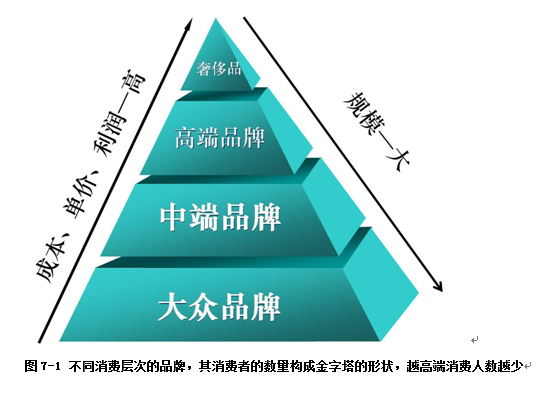 图7-1 不同消费层次的品牌,其消费者的数量构成金字塔的形状,越高端消费人数越少