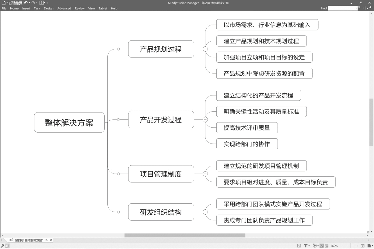 综合考虑上述因素,将初步解决方案中“产品规划”部分去掉,同时强调了“项目立项”工作。这样,在不降低改进目标的前提下,考虑到企业现状,简化了解决方案及其操作难度。如图4-7所示。