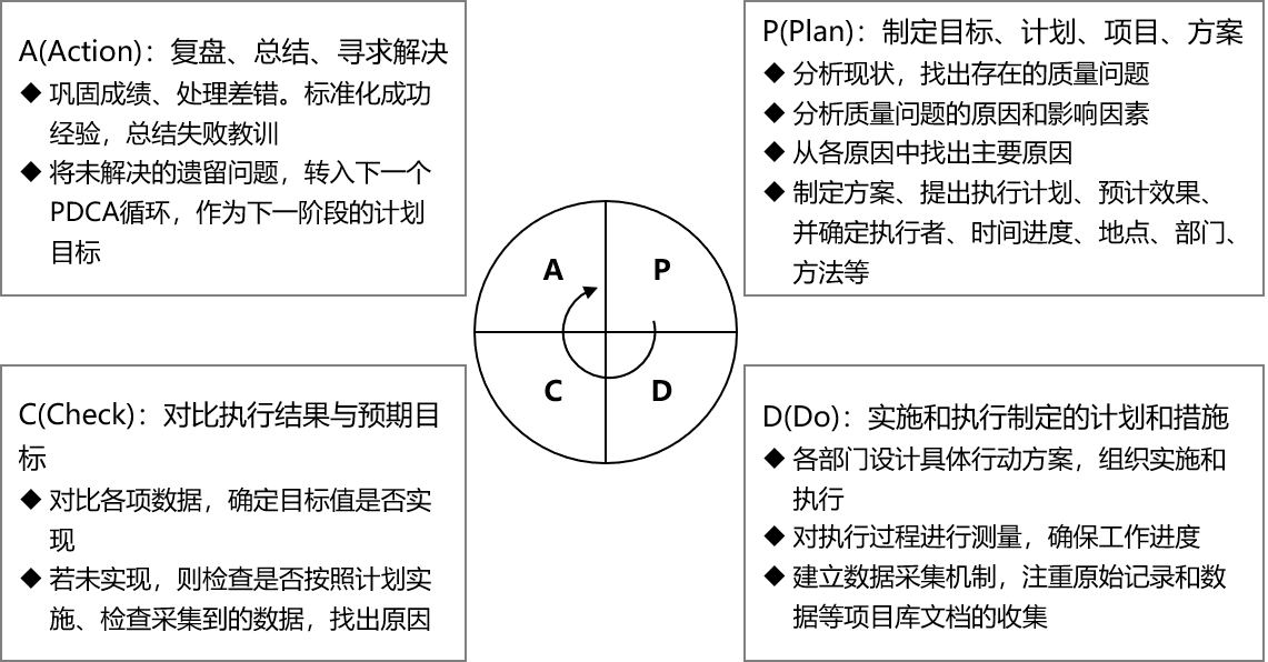 A(Action)——行动,对总结检查的结果进行处理,成功的经验加以肯定并适当推广、标准化;失败的教训加以总结,以免重现,未解决的问题放到下一个PDCA循环。