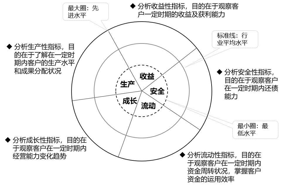 雷达图分析法是将企业的各项评价指标比率,集中画在一个圆形图上,进而对企业财务状态和经营现状进行直观的综合分析与评价的图形。因其形状如雷达的放射波,且具有指引经营“航向”的作用,故而得名。企业通常选取成长性、生产性、流动性、安全性、收益性五个方面,对企业财务状态和经营现状进行直观、形象的综合分析与评价。企业也可以根据自己战略目标设置的具体情况进行指标的调整。
