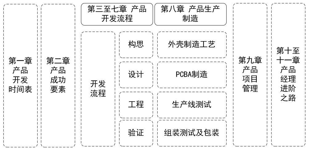 如何阅读本书呢?鉴于硬件产品的特殊性,不同产品阶段的时间间隔往往比较长,而且涉及的专业知识的差异性很大,读者可以根据自身负责产品的阶段选择相应章节阅读。本书的基本框架内容下图所示。