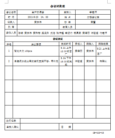 (5)会议决议的执行人与检查人、完成时间与验证关闭状况等,表14-1是一家公司的会议记录表。