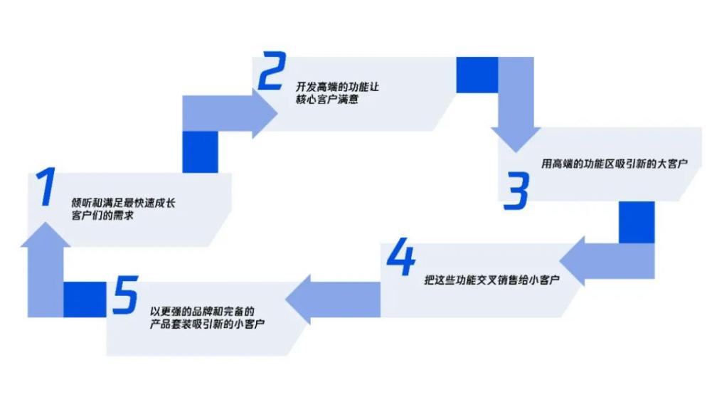 高端客户市场的持续稳健提升不仅仅能够扩大整体潜在市场规模,也可以帮助SaaS厂商扩展其SMB核心客群。拿下大客户、被外界认可的客户有助于提供品牌力、进而提高客户转化和缩短销售周期。随着时间推移,客户变得越来越成熟,他们也希望使用一些原本只适用于大客户的高端功能和模块。用高端市场的产品吸引中低端客户的策略不仅帮助SaaS企业建立更加有效向上销售和交叉销售的能力,也有助于降低中小客户的流失。