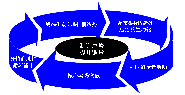 如图6-2所示, 第一步是终端生动化及传播造势:这个环节的重点是要做到“一夜成名”,首战要猛,要在极短时间里,让新品在城区家喻户晓;如果能制造持续性的话题传播,则更佳。