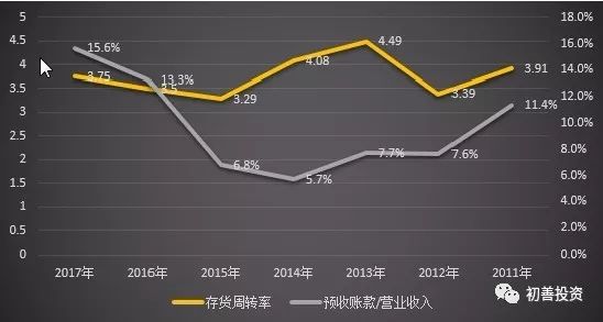 笔者看涪陵榨菜的数据,基本上预收账款与存货周转率是同向变动的,意味着预收账款越多,渠道越强势,产品越供不应求,存货自然周转得快,而近三年就是产品逐渐供不应求的时点。如图2-22所示。