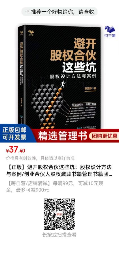 《避开股权合伙这些坑:股权设计方法与案例》本书总结归纳了很多企业都可能遇到甚至已经踩过的股权合伙和股权激励的坑,为了让更多中小企业能够避开这些坑,本书作者将自己多年咨询服务中遇到的比较有代表性的有关创始合伙人、外部合伙人、内部合伙人等方面的实际案例做了归纳和梳理,并总结了实际的问题和处理的方法,从如下几点进行具体阐释: