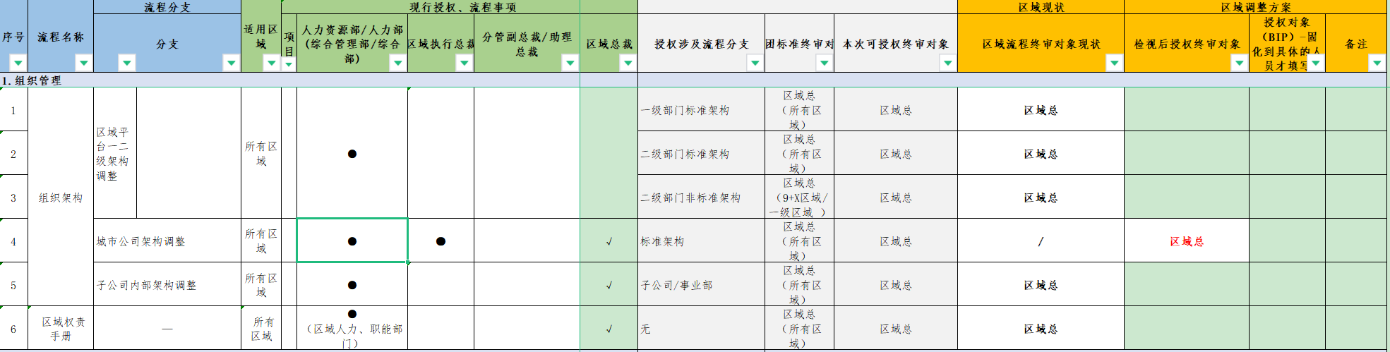 权责与流程:根据组织定位确定权责分配规则,在集团授权范围内,进行区域二次授权,形成《XZ区域二次授权表》,汇总个性化权责需求并提报集团审核,监控流程风险与审批效率;