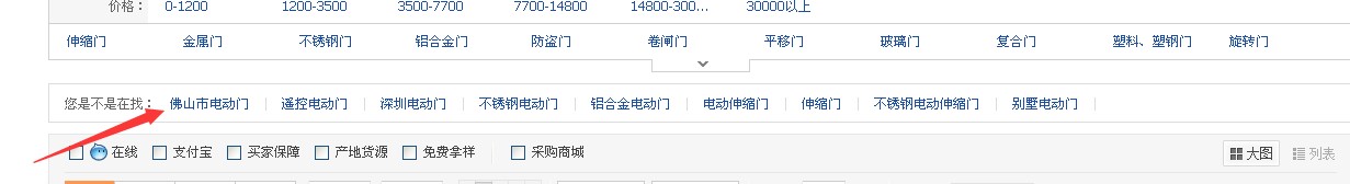 输入关键词时,所打开页面的上面部分会出现许多关键词。这些词也是根据客户搜索习惯来设置的,很多客户会根据他们的需要直接选取,这也有助于我们寻找行业的长尾词。