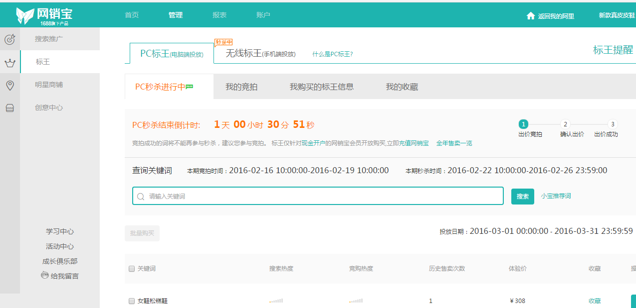 打开网销宝具体步骤为:登录1688的用户名和密码——我的阿里——应用——网销宝。进入之后,直接打开标王!之后,我们就会看到图6-7所示的情景!
