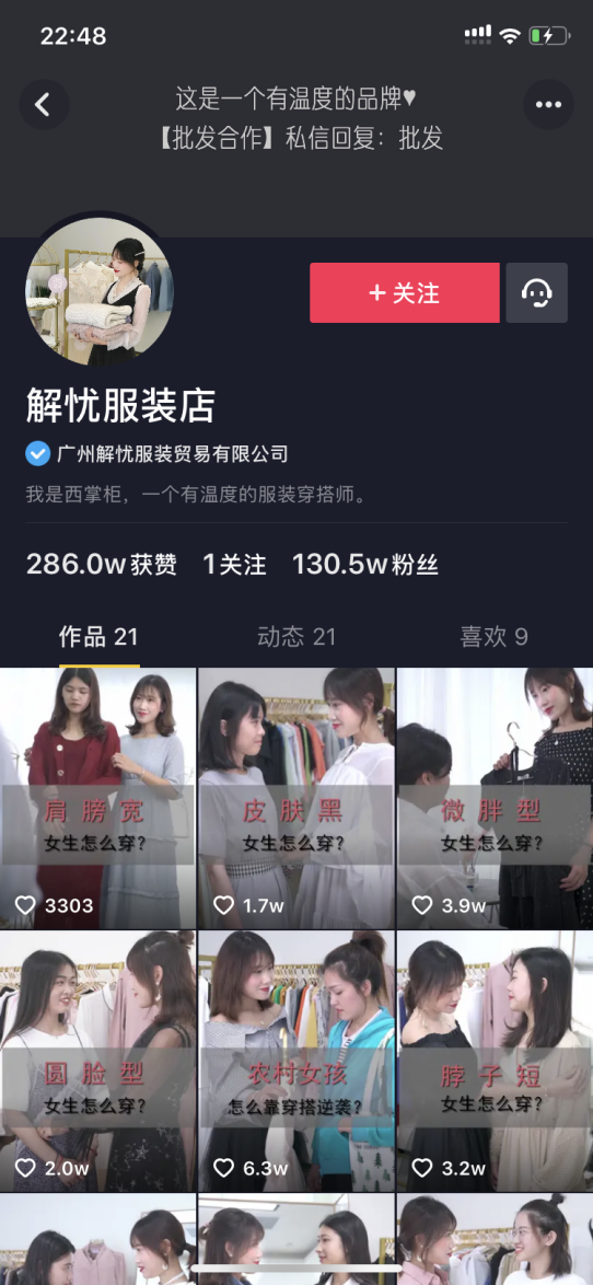 广州解忧服装贸易则通过拍摄和服装店有关的情感故事片,吸引粉丝(图4-3)。抖音的用户多半是年轻女性,对情感类短剧很感兴趣,这种方式吸引粉丝的速度较快。解忧服装店只上传了4个作品,粉丝就高达38万。但是要拍摄出高质量的视频,对策划、创作、拍摄等要求较高。