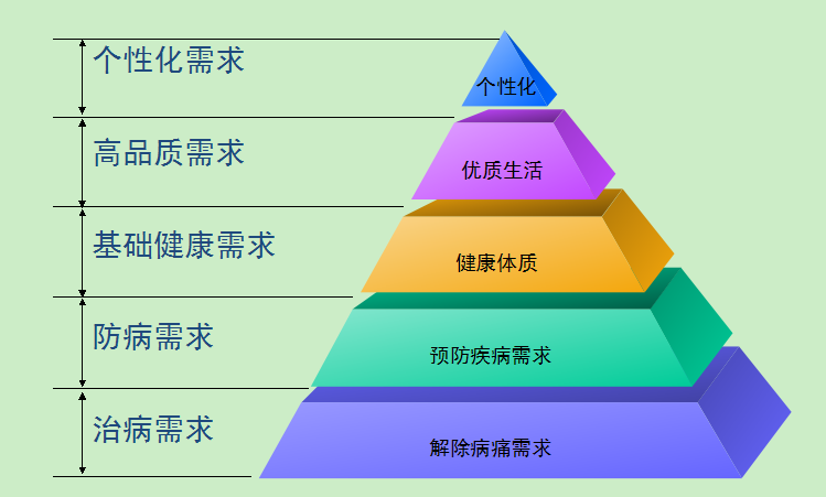 一般来说,顾客最底层的需求是解除病痛,然后转向预防、基础健康需要,这里需要界定的一点是,预防与基础健康需要并不完全是一回事。举个例子,从预防高血压的角度来看,我们会限盐饮食,但是从基础健康需求出发,我们却会以每日摄入一定的维生素与矿物质来增强体质,出发点是不同的。