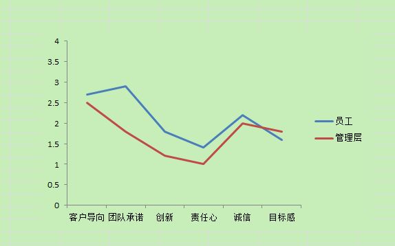 结果中管理层明显超过达到及格标准(2分)的仅有客户导向和诚信。而管理层在团队承诺、创新、责任心几个方面和员工有较大差距,而且管理层对公司文化特征的认可度普遍低于员工。这个结果和之前在同高管访谈中获得的信息是基本一致的。