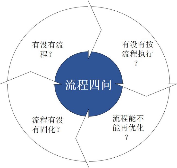 在华为公司,每当出现运营异常的时候,作为业务负责人,首先要思考的问题是这个事情有没有流程?员工有没有按照流程执行?流程还能不能再优化?流程有没有固化?通过四个问题来共识问题,并促进问题的长期解决,俗称流程四问。