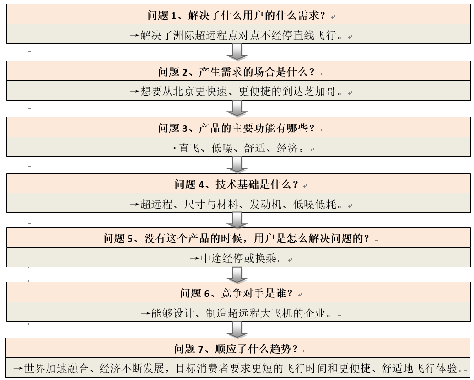 产品定位需要回答以下问题,图2.7以洲际远程客机为例进行简介。