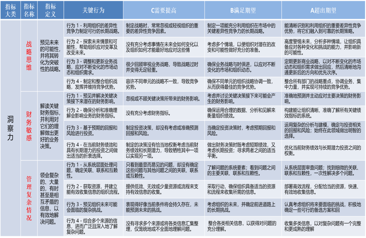 右边的表是具体的行为描述和行为等级,以洞察力这个维度的三个能力为例,如“战略思维”,包含这个能力指标的定义,能力指标的四个关键行为描述,能力指标分为了三个行为等级,从“需要提高”到“满足期望”到“超出期望”,这样的行为等级便于我们在评估的时候评出每个被评价者的能力水平高低。