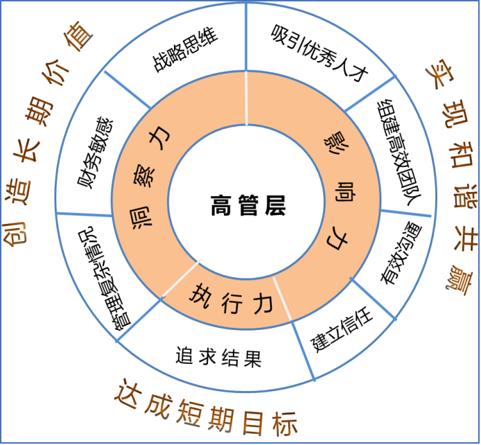 左边的构图是一个同心圆的形状,由三圈圆组成一个同心圆。最内圈是“高管层”,指明这个模型是用在高管层级的;往外第二圈是胜任力指标的三大类(即指标维度):洞察力、影响力、执行力;往外第三圈是胜任力的八个指标,涵盖了对高层的八个能力要求,分别是财务敏感、战略思维、吸引优秀人才、组建高效团队、有效沟通、建立信任、追求结果、管理复杂情况;这八个能力对应着第二圈的三个指标维度:洞察力、影响力和执行力;其实还有一圈,在同心圆以外,是创造长期价值、实现和谐共赢、达成短期目标。洞察力维度的能力要求是为了创造长期价值,影响力维度的能力要求是为了实现和谐共赢,执行力维度的能力要求是为了达成短期目标。