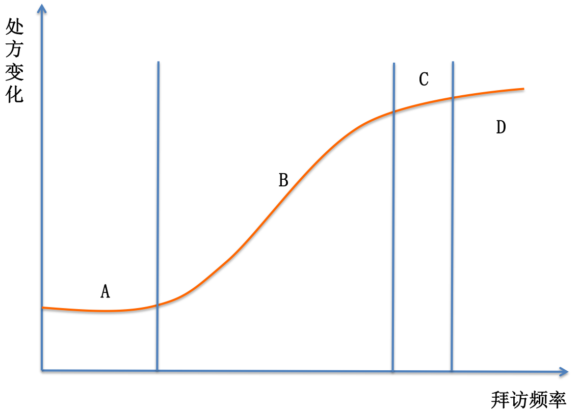 我们会看到,随着拜访频率的变化,医生处方也在发生变化,这个曲线就是客户反应曲线。A段曲线中拜访的频率是很低的,这个阶段的拜访对医生的处方是没有实际影响的,只能起到维持联络的作用。B段曲线中显示,在这个阶段中随着拜访频率的增加,医生处方数也会逐渐增加,每增加一次变化很明显。C段曲线是最佳频率,通过这个频率的拜访,拜访这种手段能够对医生产生的影响达到最高值。D段曲线会看到拜访频率已经对医生处方没有直接影响了,这时候增加拜访频率的意义就不大了,实际工作中还有可能出现处方下降的情况(因为拜访太多,医生烦了)。如图5-7所示。