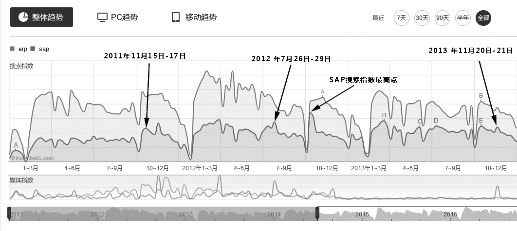 图7-2 用【百度指数】查看ERP、SAP近年来的搜索量整体趋势