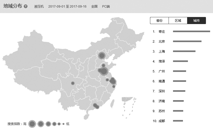 【人群画像】:该模块关注搜索者来自哪些地域,目前只能对人群所在地、年龄和性别画像。如图7-8所示,可以按省份、大区和城市为人群画像。