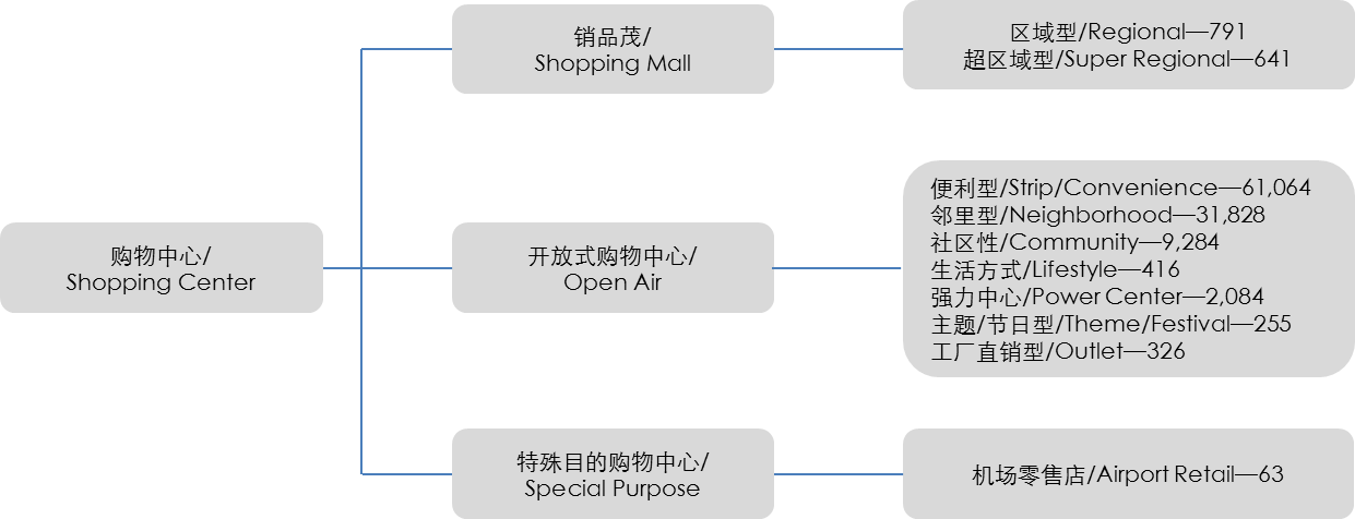 图4-2 美国购物中心(Shopping Center)组成图及2011年各购物中心数量