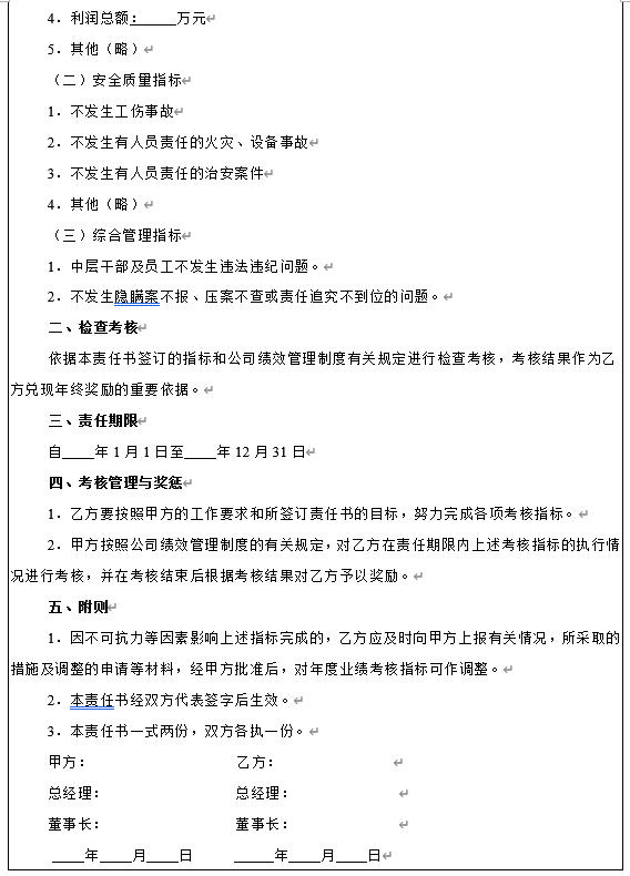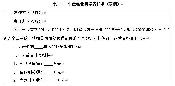 经营目标责任书一般以年度为周期来确定企业的经营管理目标,一般与企业负责人或领导班子签订,考核结果与签约者的薪酬挂钩,内容比较简练,以经营指标和指标预期目标为主,要少而精。