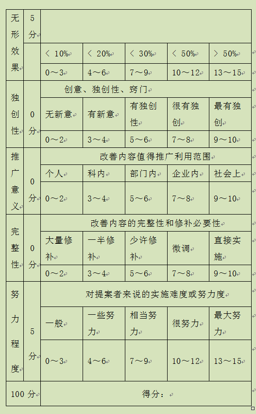 有形效果是可以量化的,但无形效果及其他项目(创意、工作难度、努力程度等)的评价基准比较难以确定,多数情况下要靠主观判断来决定改善的等级。