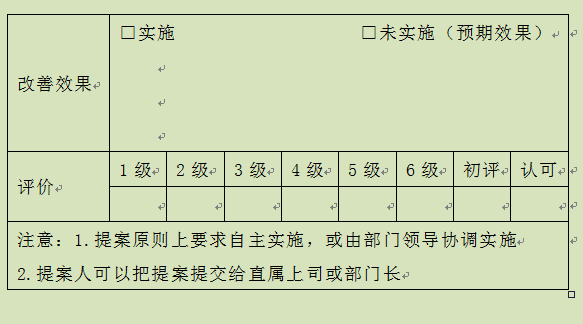 如前所述,改善提案活动是一种通过标准化和制度化的评价、奖励措施来推动的改善活动。因此,开展这项活动最重要的工作就是建立一套提案等级评价标准及与之相对应的奖励制度。