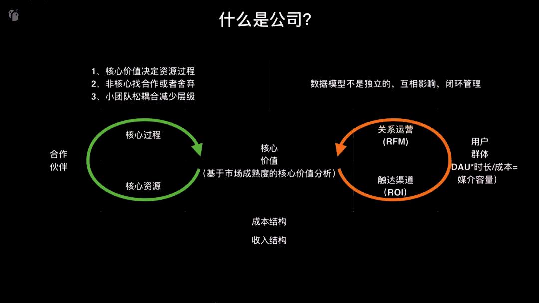 支撑闭环成立要计算成本结构和收入结构。互联网看的是用户群里是什么?DAU×时长/成本=媒介容量。DAU是很多互联网公司用的用户质量。如何触达用户呢?一定会涉及与用户、客户的关系运营模式(RFM),通过渠道触达,构建企业在用户面前的品牌认知。CSM是触达渠道里成本极低的,新客拓展的成本比较高。老客户持续运营的成本是新客户的1/7。透彻分析用户,然后回到产品,统筹核心资源,例如优秀的工程师、产品经理。