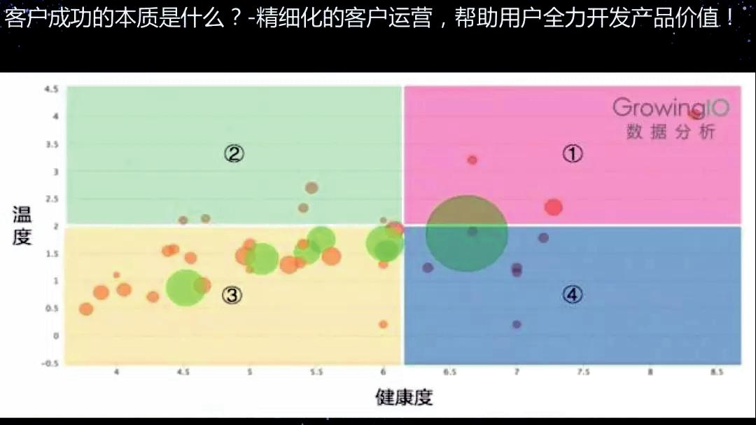 客户成功的本质:精细化的客户运营,帮助用户全力开发产品价值。产品帮客户解决什么痛点?实际上分为健康度和温度,四个颜色,落在这个区间就意味着客户对系统使用频率最高,应用效果最好,当然付费意愿也是最好的,这是你最想要的客户。如图3-9所示。