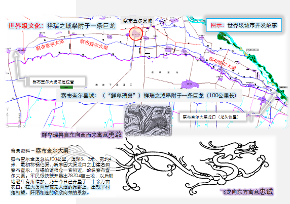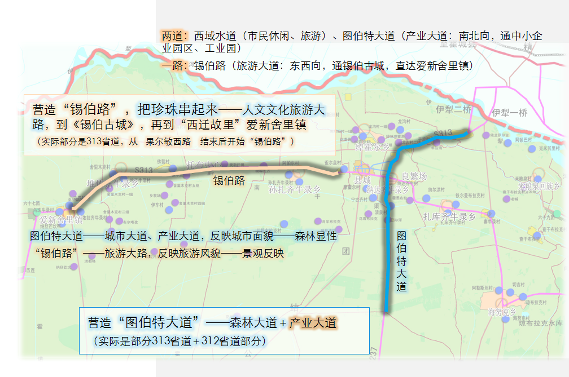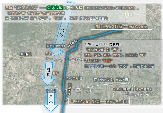 从城市规划策划角度看,图伯特大道为“骨”;湿地、老城、新城、创业园、工业园为“肉”;锡伯文化为“血脉”;察布查尔大渠——水为“灵魂”,以此再造城市水系。