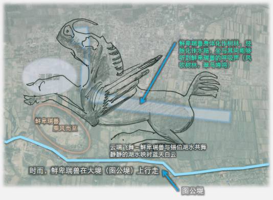 鲜卑瑞兽的前蹄踏出“源圃园”,后蹄踏出“锡伯湖”,翅膀化作湿地,后翼化作大道(图伯特大道)。