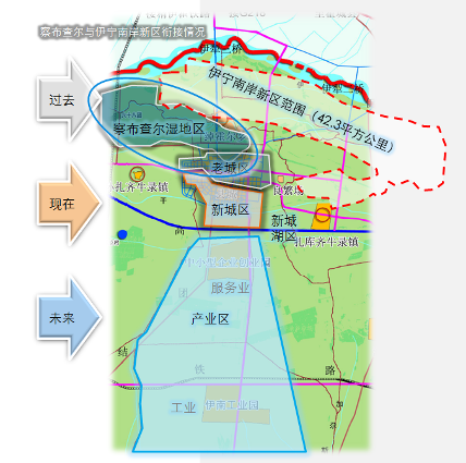 战略定位上的递进关系:西域湿地应与伊犁河边的自然湿地形成呼应,形成自然观光、旅游休闲、生态宜居的递进关系,是锡伯水城的一部分,与老城区形成锡伯水城。