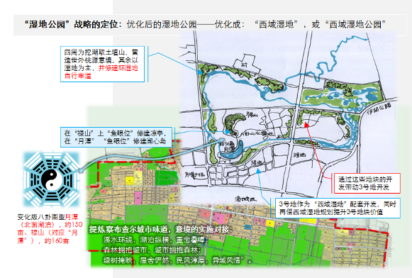 从特色城市角度讲,湿地公园应是城市的重要组成部分,特别是本次战略定位的八卦图形月潭(北面湖泊)、禄山(对应月潭)位置实为中心区域、中心点。