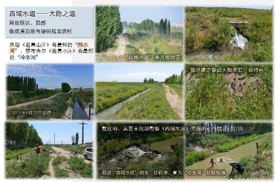 工作室专家在察布查尔未来新区的泄洪渠(西域水道营造位置)一带进行实地勘察,以确定西域水道的营造可行性。发现这里的水非常凉,水流湍急,有一公里长,这让我想起了承德避暑山庄内一公里长的热水河。因此,可以突出旅游特征:承德避暑山庄有世界上最短的“热水河”,察布查尔有世界上最短的“冷水河”,加强了和承德避暑山庄的联系。