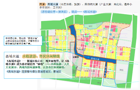 两道:西域水道(市民休闲、旅游)、图伯特大道(产业大道:南北向,通中小企业园区、工业园)。