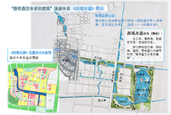 水云坊、窄西湖,新城区水系、老城区水系,并与察布查尔湖、锡伯湖、湿地、察布查尔大渠等形成“察布查尔水系价值链”。