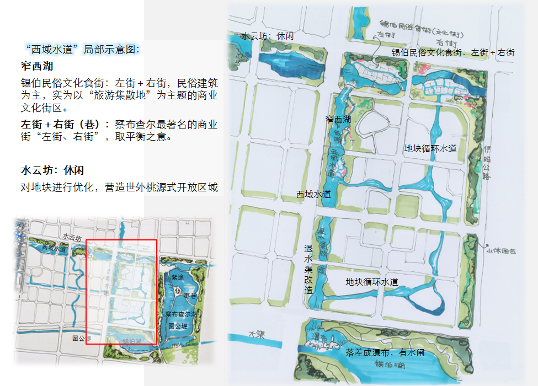 注明:由于历史原因,老城区大规模修建水道不现实,在西域水道营造上主要考虑新老城区水道的技术问题,让上水尽可能畅顺流出。