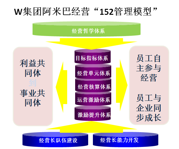 从本质上看,W集团的“阿米巴经营”经营模式是一种小集体独立核算制度,是从经营角度去解决企业各类管理问题的经营模式,也是以经营哲学为指导,“年度运营计划”为基础,运用单位创造价值核算工具、分析工具实现企业组织的“量化分权”,达到“自我循环改善”的经营体系。通过这种做法,让第一线的每一位员工都能成为主角,主动参与经营,进而实现“全员参与经营”。