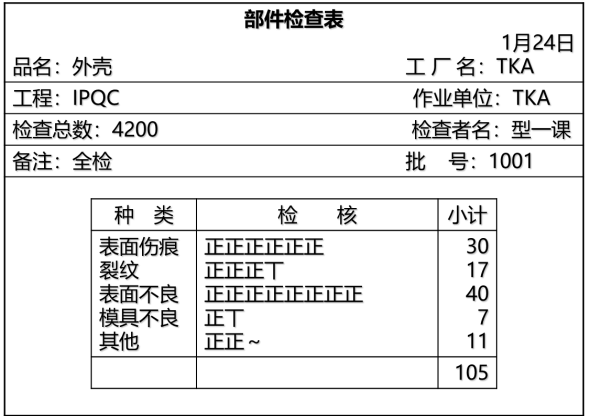 为了获取数据并加以整理,必须采用某种手法方便记录有关数据,并且以便于整理的方式把这些数据集中起来。检查表就是适应这种需要而设计出来的一种表格;通过检查表,只需进行简单的检查(确认),就能收集到各种信息。