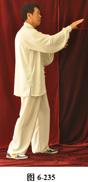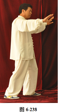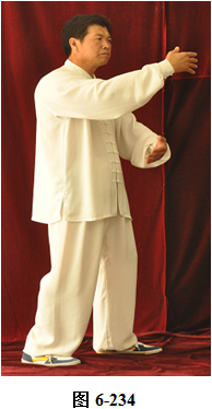 接上式,腰微含,向东南稍转,两手随腰外翻转向稍东南,变为横立掌,两手心均向内,成护胸腹之式。腰微含回转,朝向正东, 两手臂随之回转划一小圆,旋翻手心向下,腰向下沉,屈膝成半蹲式,两手臂随之下沉,成斜向前立掌。腰微上提两臂随之前撮,腰向左、右外撑,重心移于左腿,右膝微屈,两臂随腰左、右外撑划立圆。腰向下沉,两臂向下划至两膝旁,两腿随腰下沉,成半蹲状。腰上提,两臂随之上搂,双手成交叉状至面部前,重心立于左腿, 提右膝,抬右腿,腰向后微含,两臂随之向左右外开,两手旋翻掌心向外, 略宽于肩, 右脚尖随之向稍东南方慢慢踢出(见图6-233至6-239)。