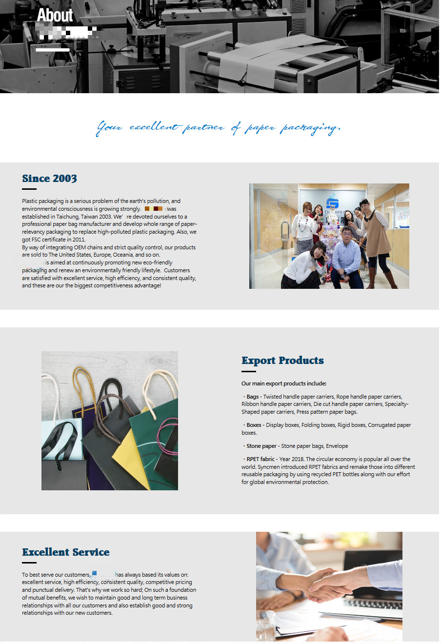 第三,工厂本身其实条件一般、但自己控制生产的,依然可以考虑单独做工厂展示栏目,不过主要目的不是为了证明工厂实力(本来也没有),而是增强这家公司的真实感,让买家更愿意联系你。这时,既要使用真实的照片来体现可信度,又要扬长避短、不让买家直接看到工厂不好的那一面,选择照片就很需要一些技巧。如果工厂条件不错,那么宏观场景照片和局部特写照片都可以使用;但如果工厂条件一般,那么完全可以全部使用局部特写照片,专门拍设备或工人正在进行某个操作时的细节,并适当使背景模糊。同样的,这种情况最好也多配上几句文字解说。即使在工艺和设备上实在没有什么优势,也可以重点去介绍在质量把控上的细致态度。