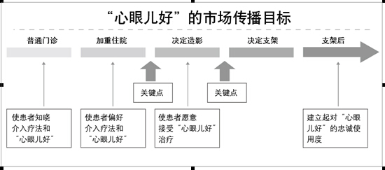 对于不同阶段的患者确定了梯次化的传播目标,其中又以冠脉造影为分水岭确定了两个传播的关键点,在造影前使患者偏好介入治疗和“心眼儿好”支架,在造影后促使患者接受“心眼儿好”治疗。如图6-5所示。