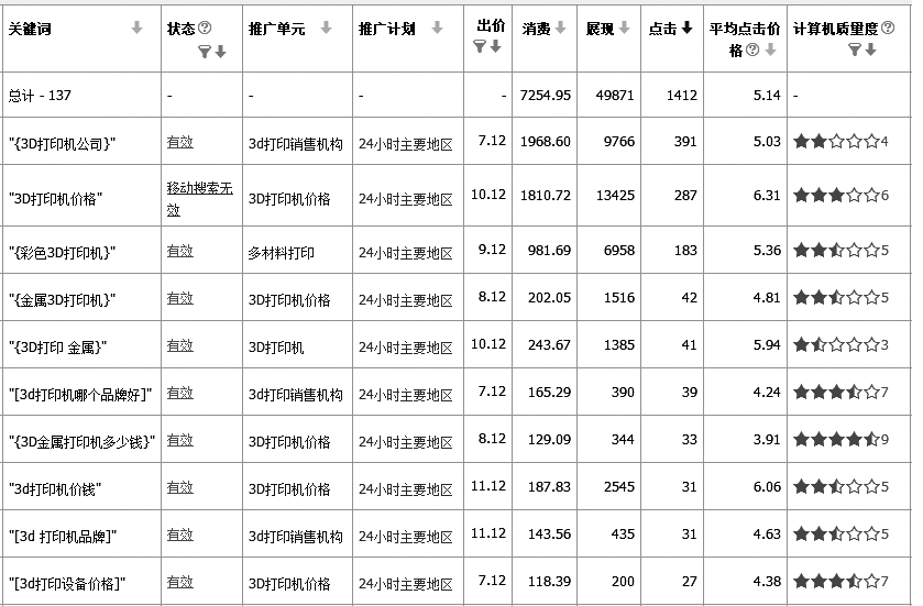 第十列【计算机质量度】,就是关键词的质量得分,分为PC端质量度和移动端质量度。我们来假设一个场景,让你好理解什么是质量度:假如你的广告出价10元,排名第一,你的竞争对手出价5元,排名第四。由于你的广告不吸引人,一天下来只被点击了一次,只消费了10元,而你的竞争对手尽管排名不好,但广告吸引人,一天被点了4次,消费20元。对百度来说,你的竞争对手对百度贡献更大,应当排名更靠前。于是,百度就把你的竞争对手广告提到第一名,把你的放在第四名,尽管你出的价比他高。这就是质量度的由来,按质量度进行排名,会让百度赚得更多。我们想办法提高质量度会少花钱、多办事。