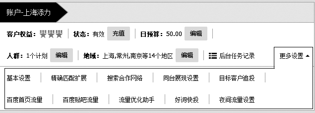 第三项:【日预算】。此处为整个账户的日预算,其下属的每个推广计划也可以设置各计划的日预算。一般而言,账户的日预算是所有计划日预算的总和,百度规定账户的日预算不低于50元。