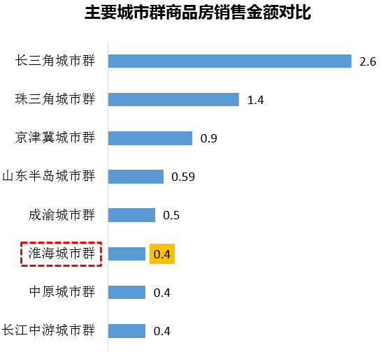 而从商品房销售金额对比来看,淮海城市群与与长三角、珠三角、京津冀城市群相比差距非常大,其商品房销售金额仅为0.4万亿元,房地产市场成熟度低。