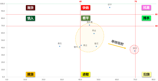 根据九宫格阶梯筛选法则,处在阶梯阴影区为重点拓展城市:徐州处在扫货区与进取区交界,应重点关注;黄线框内的重点投资城市,主要包括商丘、宿迁、枣庄、连云港;挑货区的重点拓展城市有淮北、宿州。