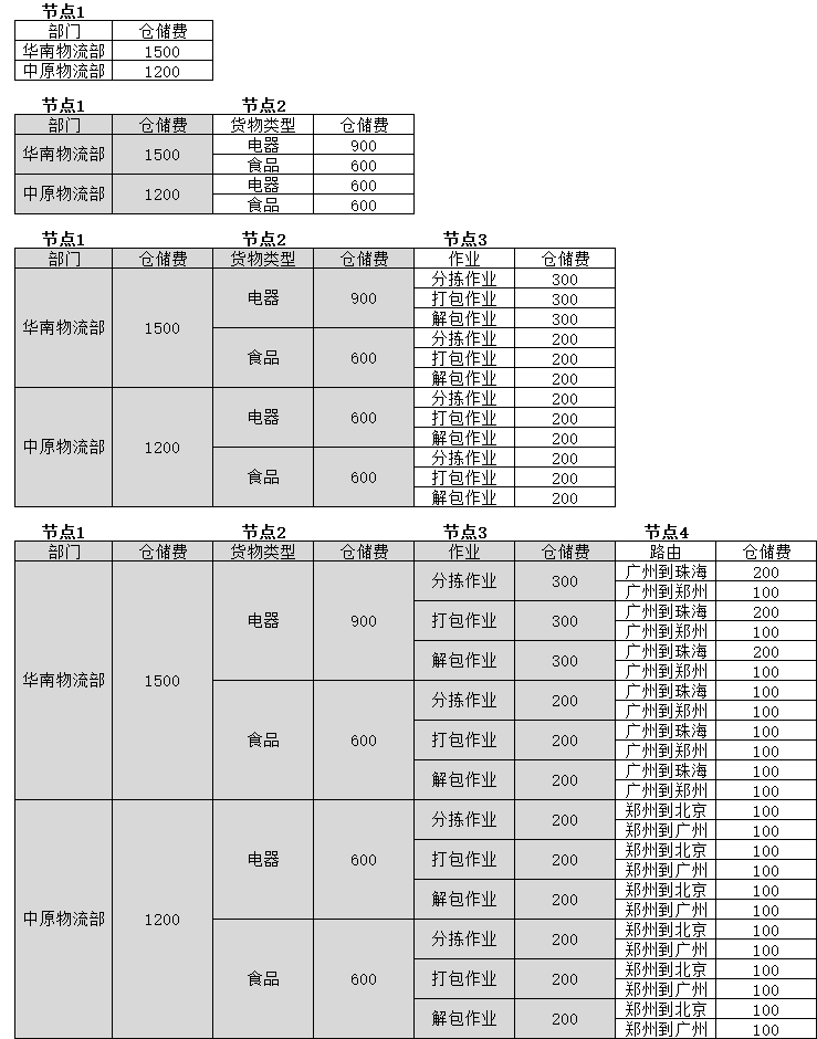节点1:仓储费归集到部门口径,取自账务处理模块"销售费用-仓储费"会计科目的部门辅助核算金额,或费用报销模块的部门仓储费用金额。如果仓储费归集到公司,则按场地面积向不同部门分摊。