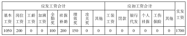 应扣款:工装扣款、罚款、个人社保、工伤保险、其他。
