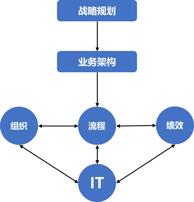 流程在管理变革项目中的地位是战略执行的中间层,从上承接战略导向的业务架构,左右对接组织、绩效,然后通过IT固化。逻辑关系图如下所示: