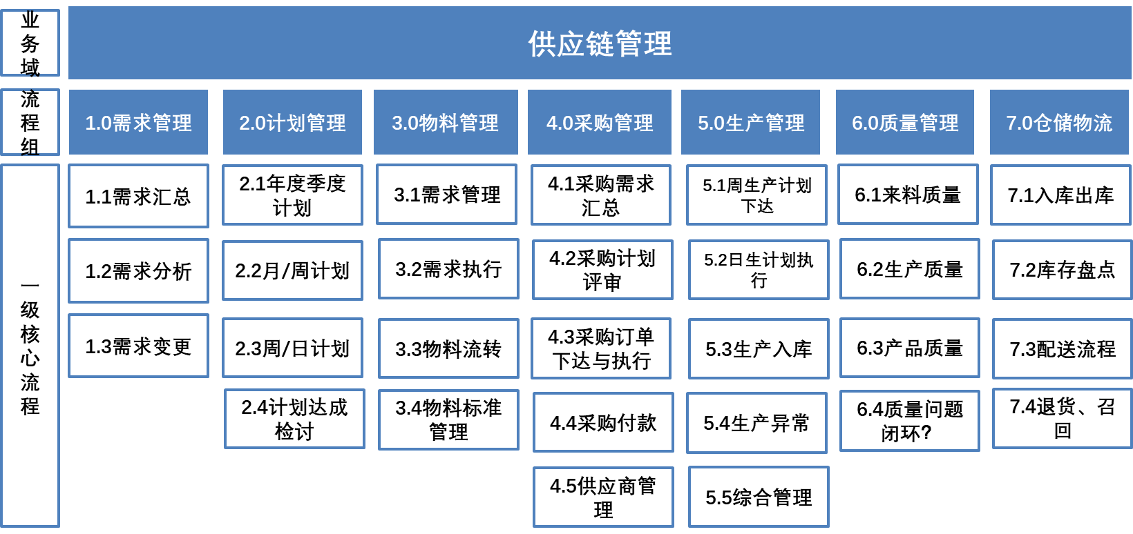 比如,我最近在主导的一个供应链管理改进变革项目,梳理出的整体业务架构如下: